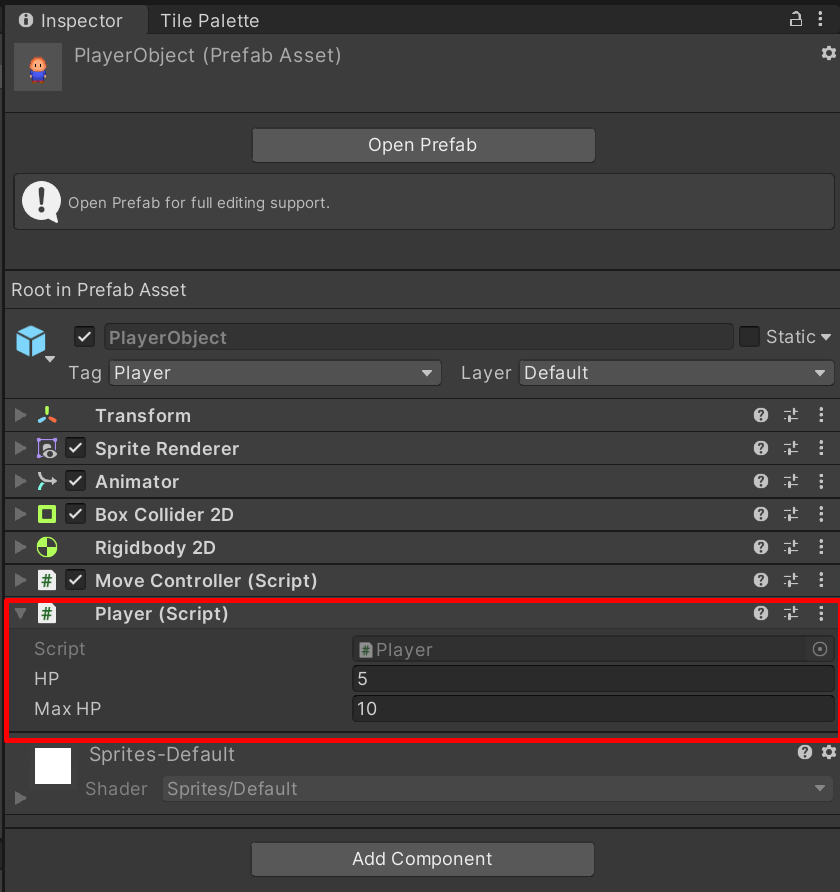 PlayerObject 프리팹의 Player 컴포넌트의 HP의 값을 5, MaxHP의 값을 10으로 변경합니다.