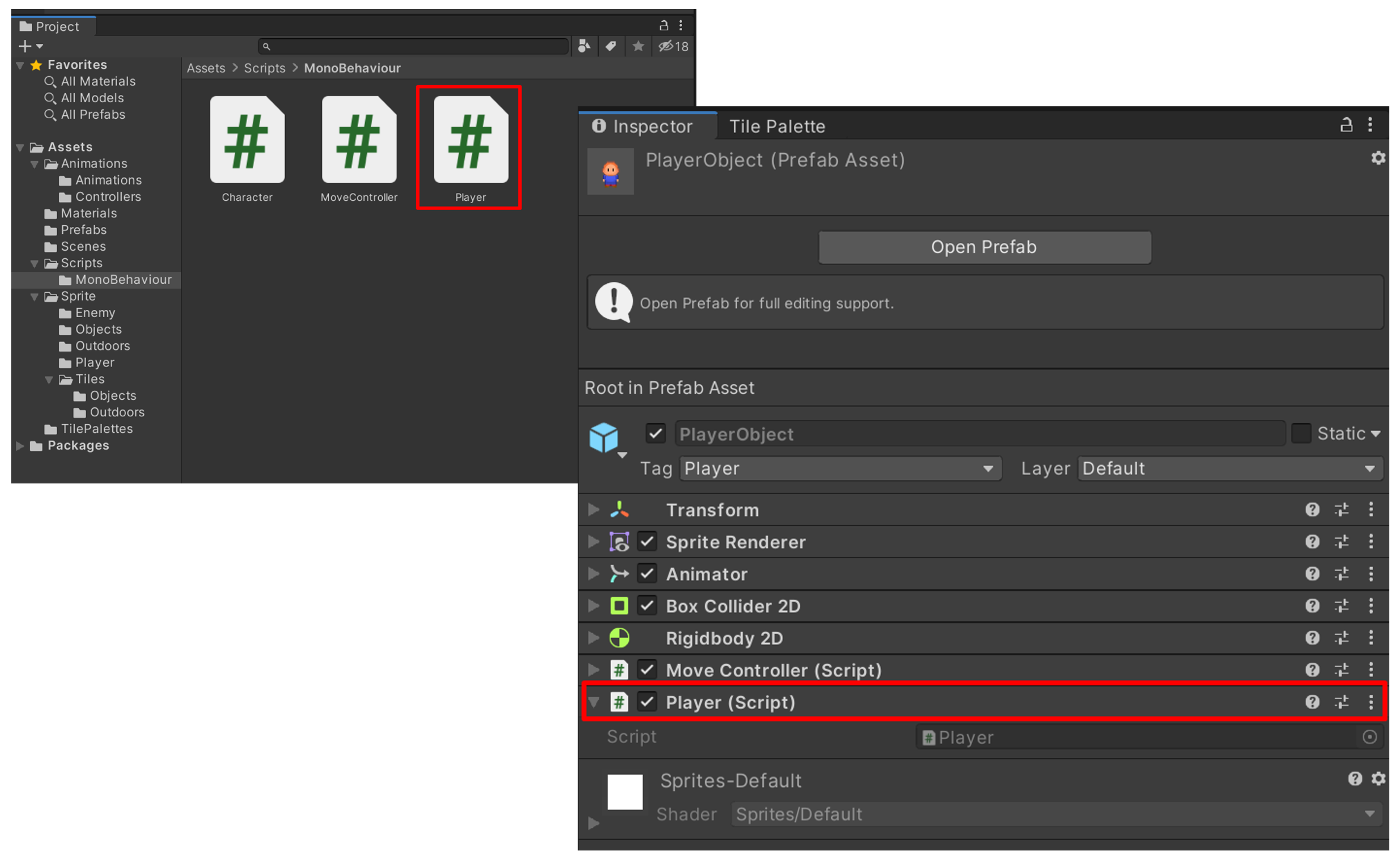 2. PlayerObject 프리팹에 방금만든 Player 컴포넌트를 추가합니다.