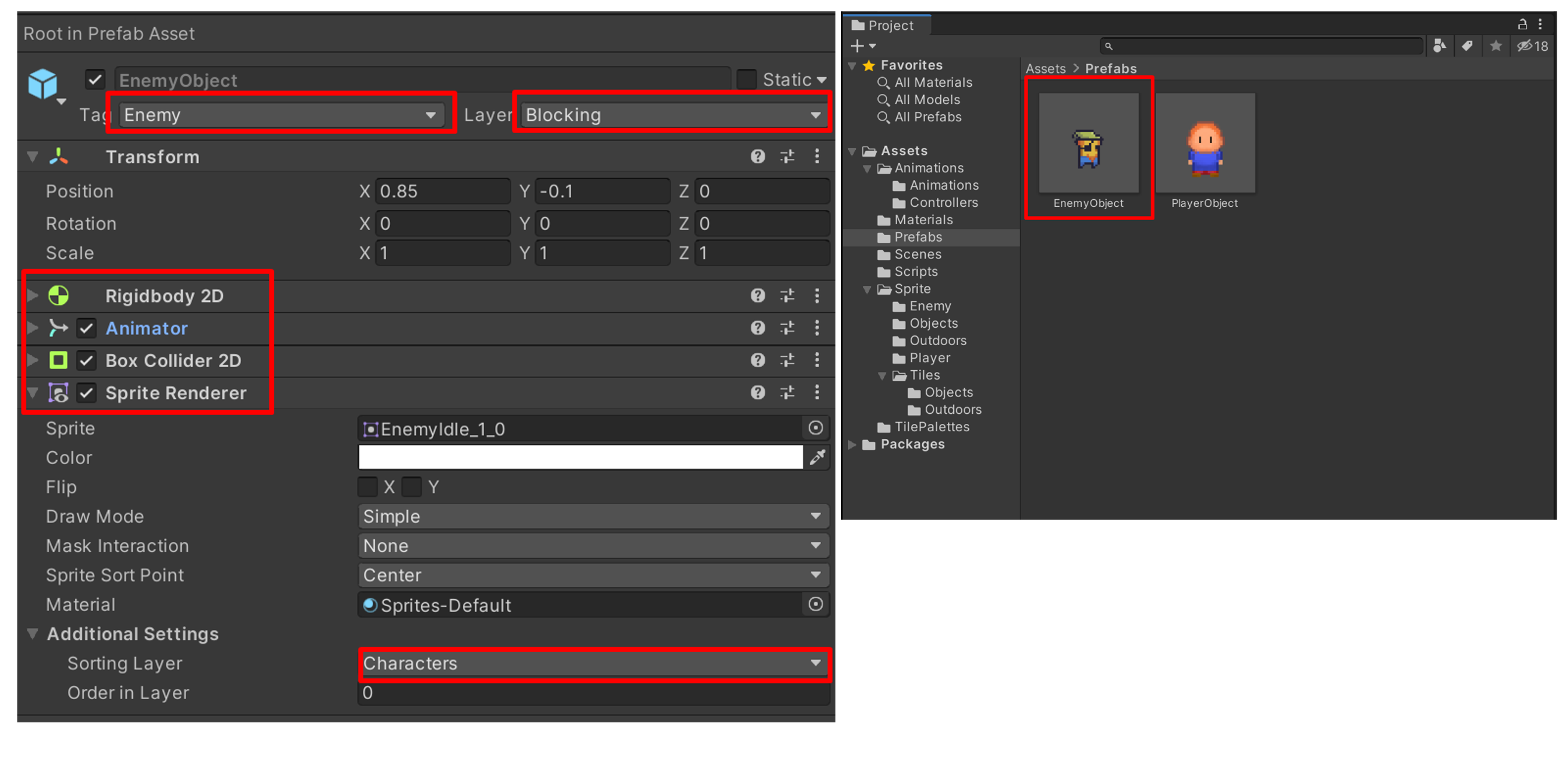1. EnemyObject를 만들고 Tag에 Enemy, Layer에 Blocking을 설정합니다.