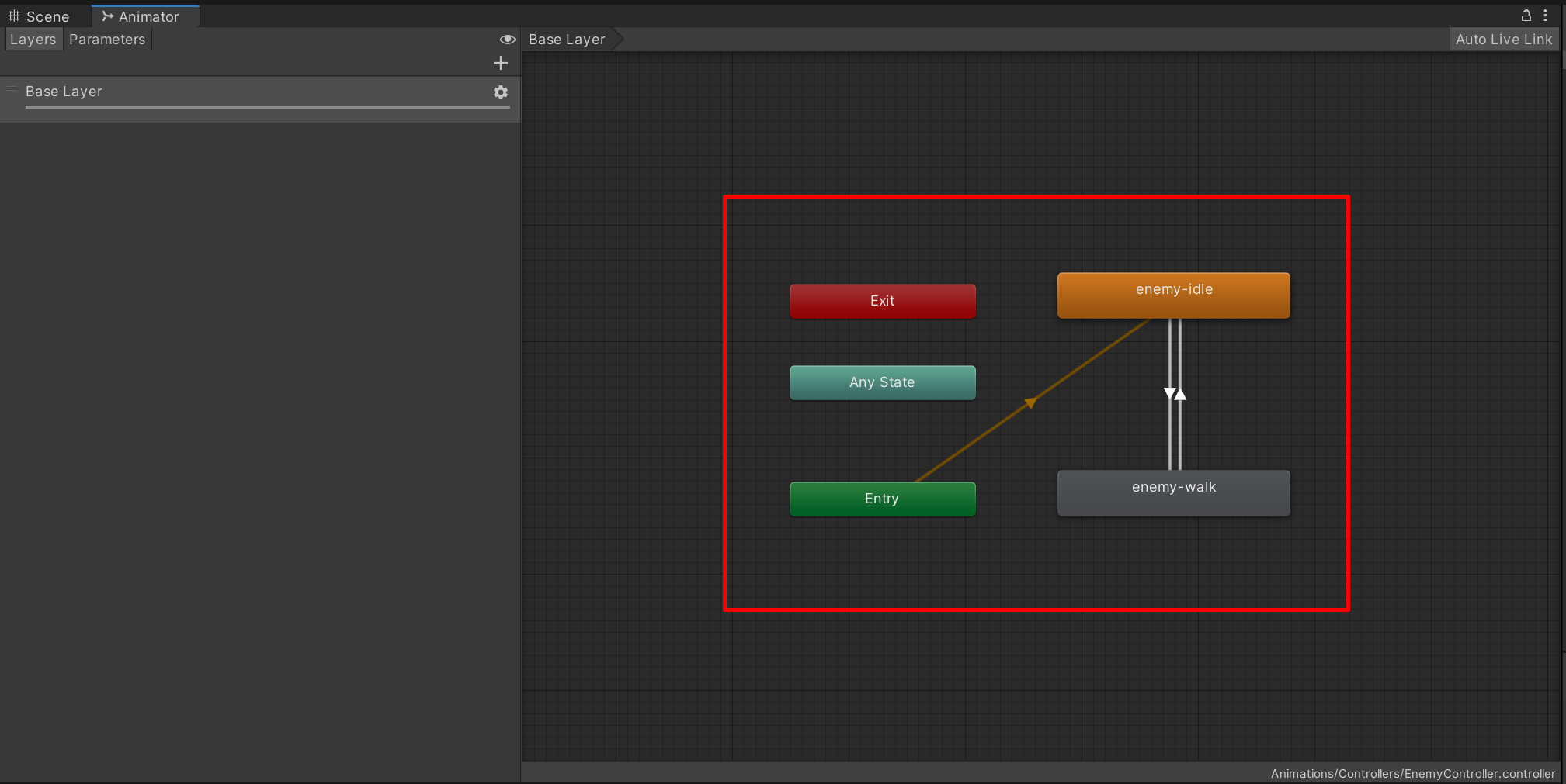 EnemyObject의 Animator 컴포넌트에 적용되어 있는 EnemyControlloer 애니메이터는 사진과 같이 설정하였습니다.