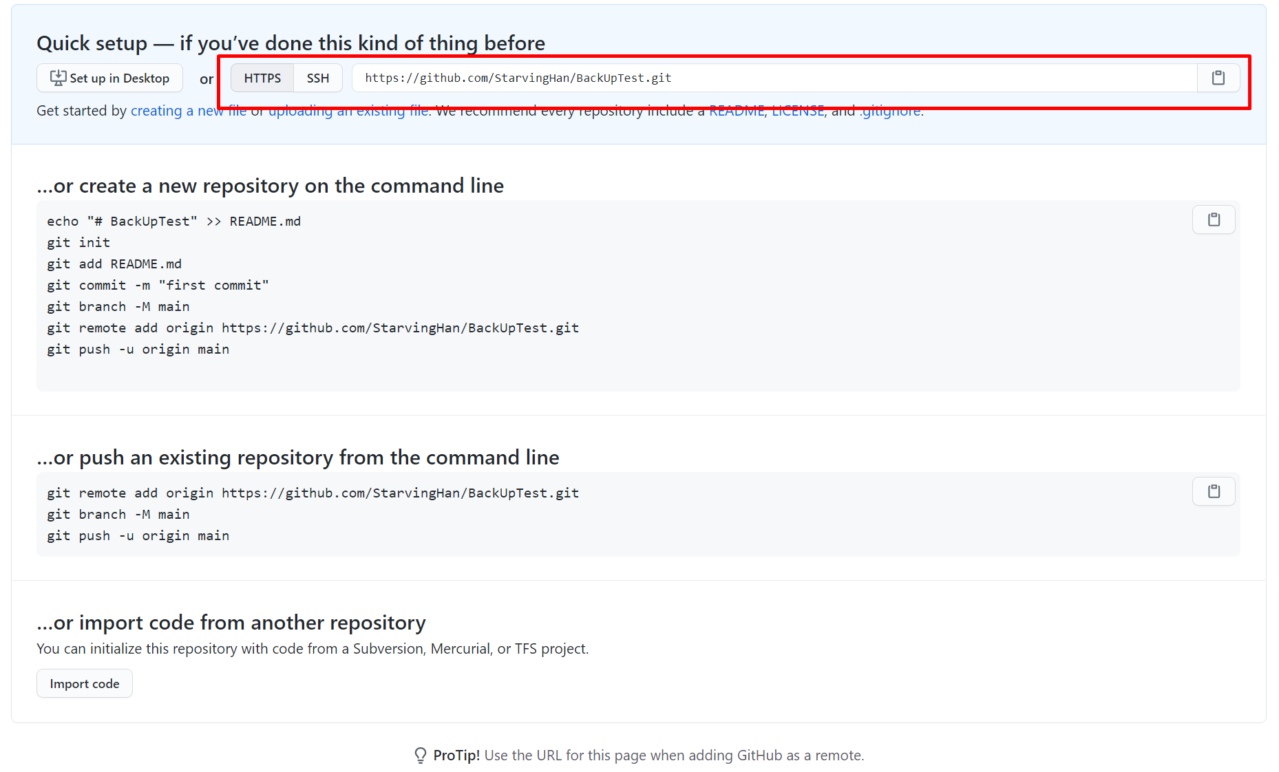 저는 BackUpTest란 이름의 저장소를 생성하였습니다.