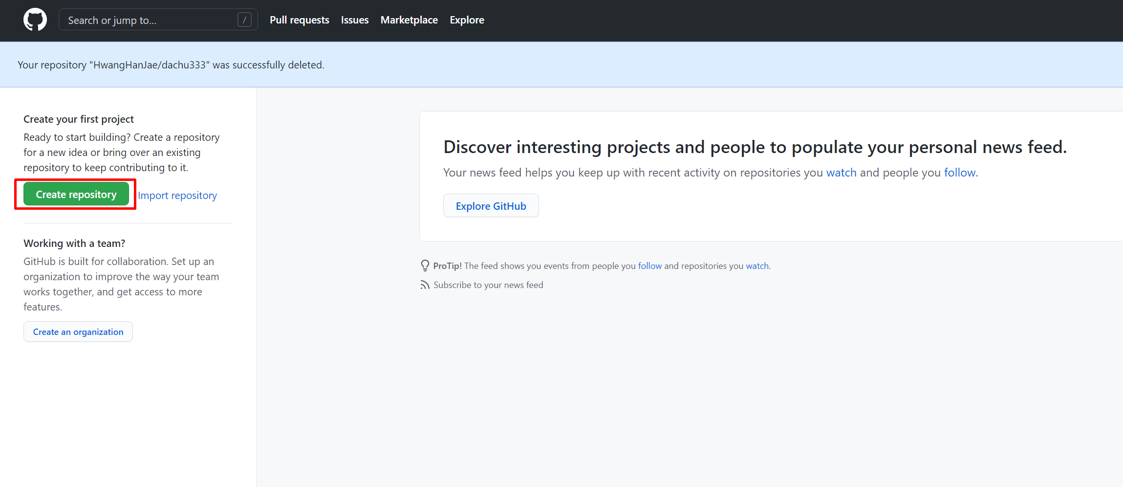 왼쪽 초록색 배경의 Create repository 버튼이 보입니다.