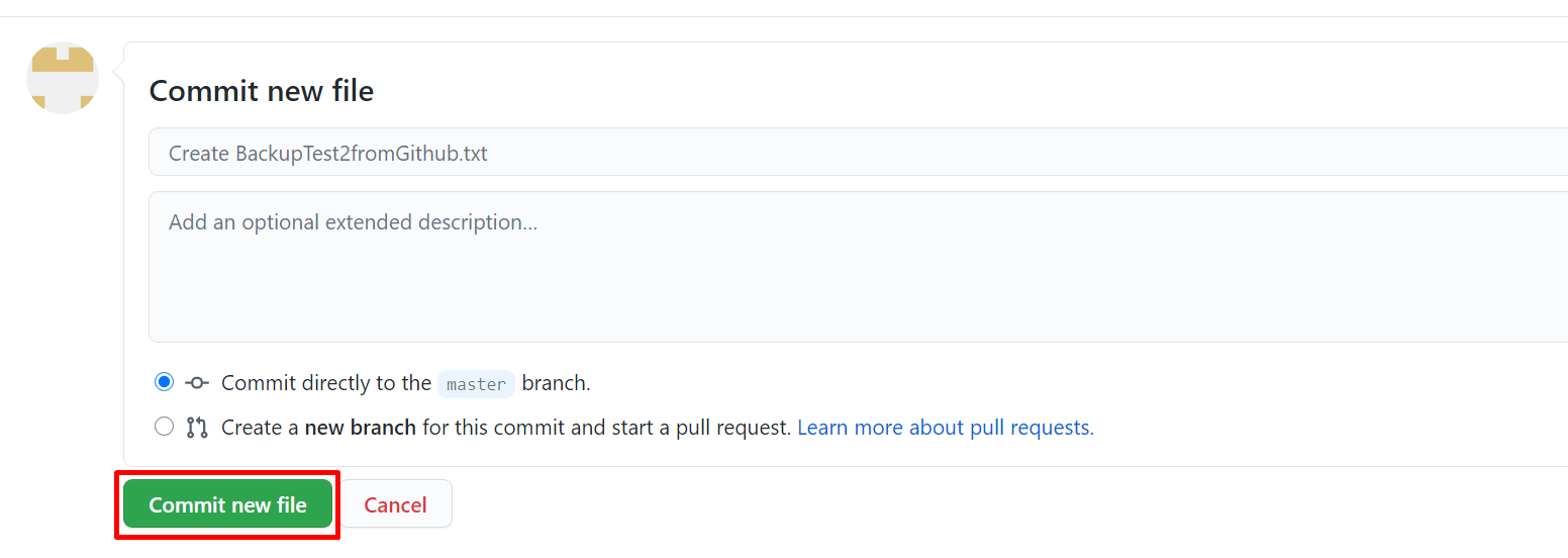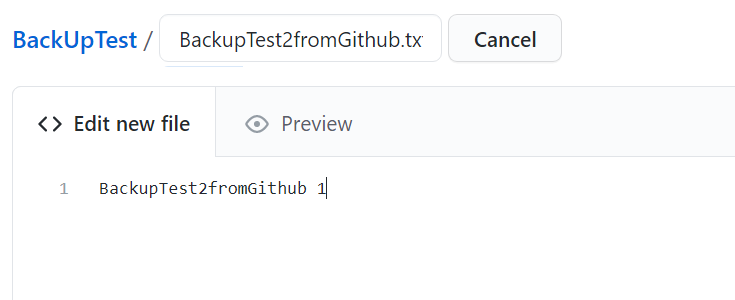 저는 BackupTest2fromGithub.txt 을 파일이름으로 BackupTest2fromGithub 1을 파일 내용으로 입력하였습니다.
