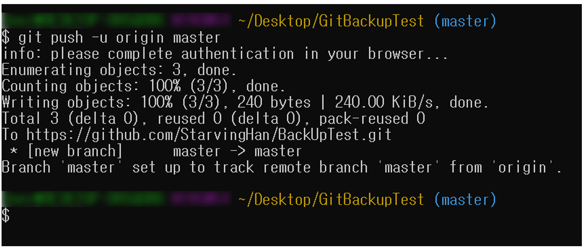 git push -u origin master 명령어를 입력합니다.