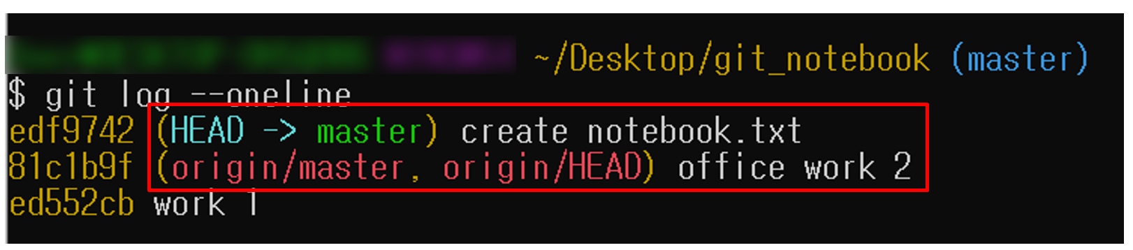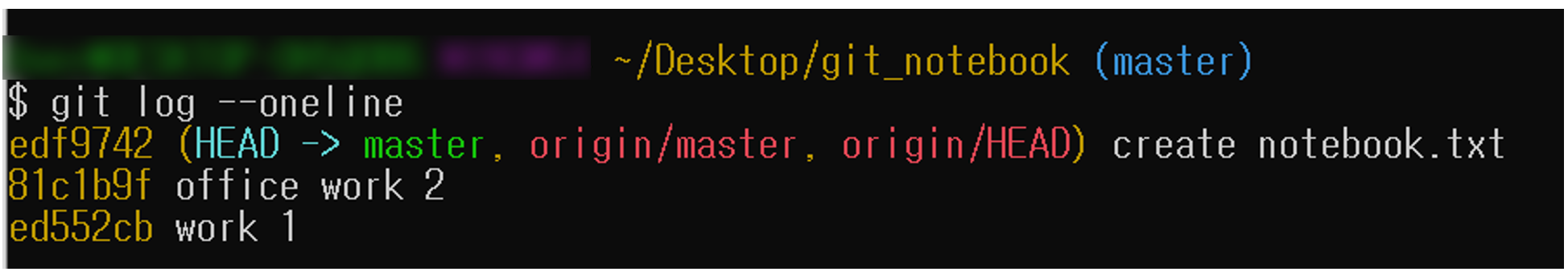 git log --oneline 명령어를 입력하여 로그를 확인해보니 지역저장소의 master 브랜치와 원격 저장소의 master 브랜치가 최종 커밋을 가리키게 됩니다.
