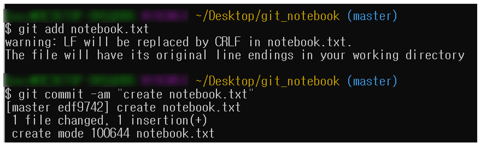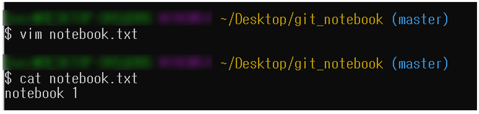 git_notebook 디렉토리에서 notebook.txt를 만들고 notebook 1이라는 내용을 입력하고 저장하였습니다.