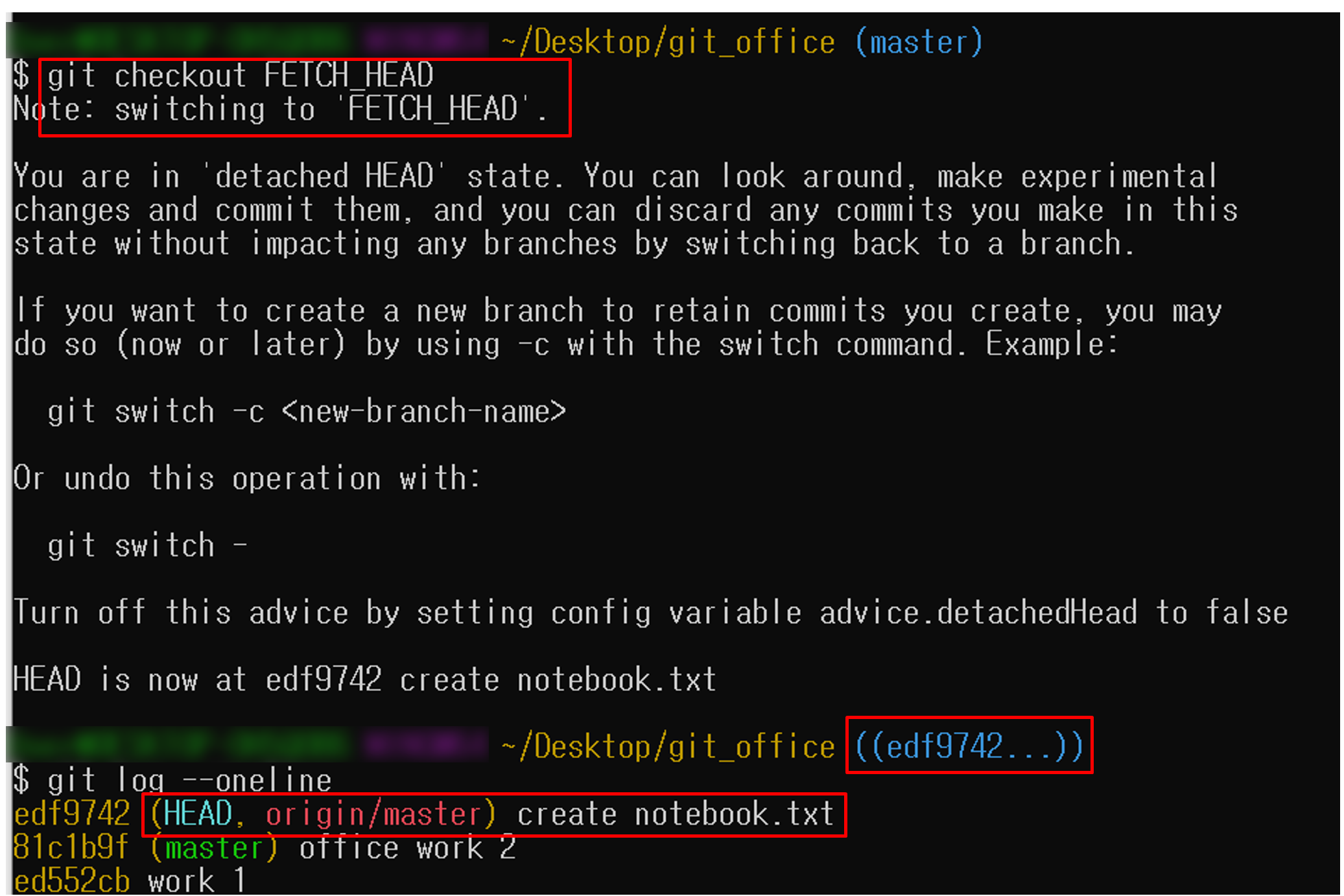 git checkout FETCH_HEAD 명령어를 통하여 FETCH_HEAD로 체크아웃 합니다.