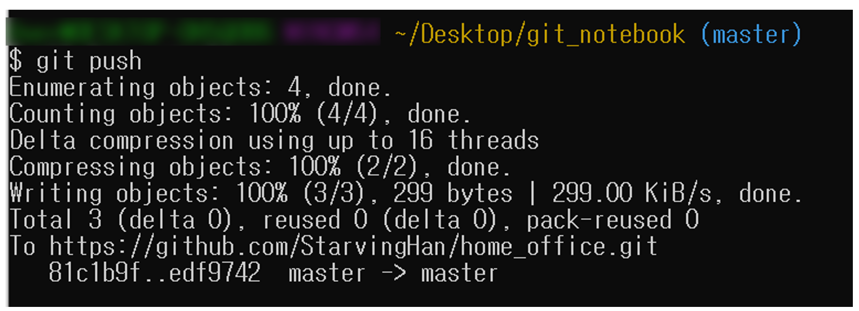 그리고 git push 명령어를 입력하여 지역 저장소의 커밋을 원격저장소로 올리라고 알려줍니다.