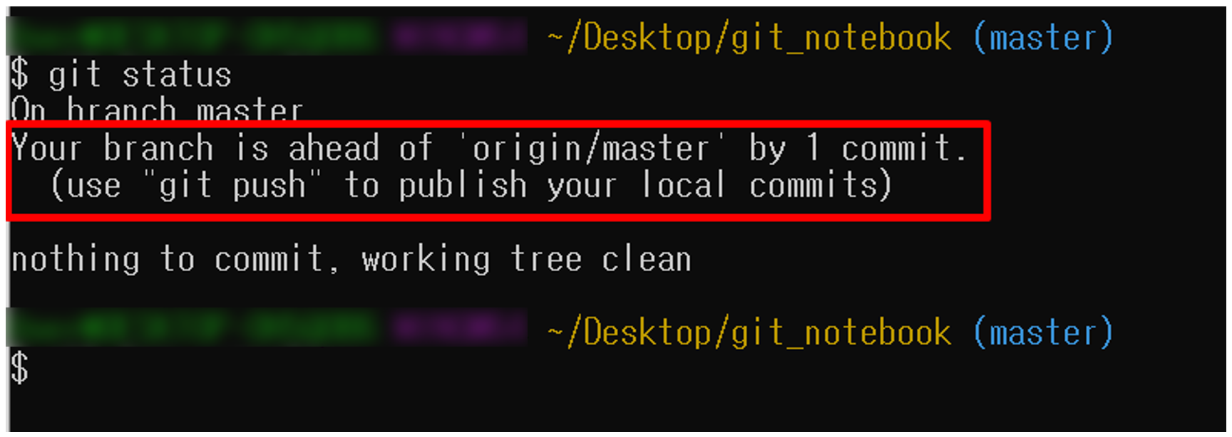 현재 master 브랜치가 origin에 있는 원격 master 브랜치의 커밋보다 하나 앞서있다고 합니다.