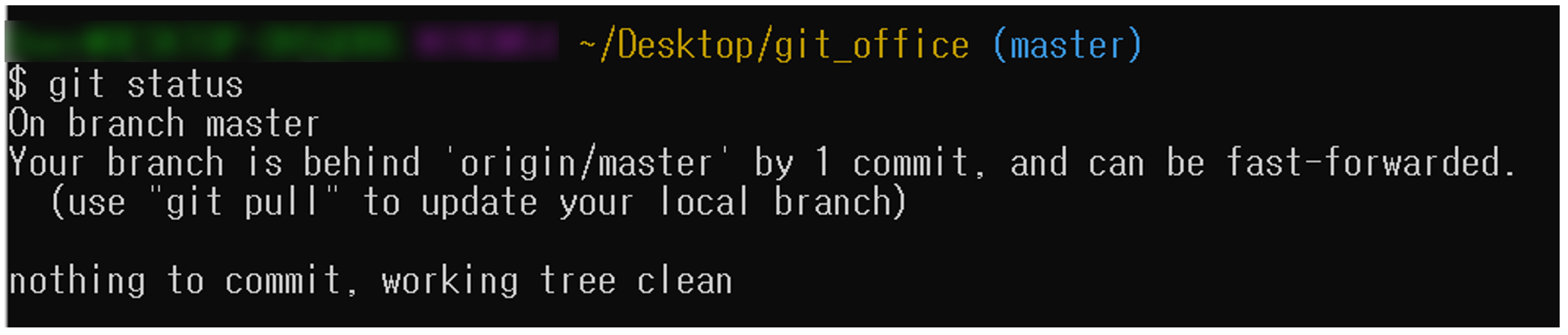 git status 명령어를 입력하여 확인해보니 현재 브랜치가 origin/master 브랜치에 비해 1 커밋이 뒤쳐져있다고 합니다.