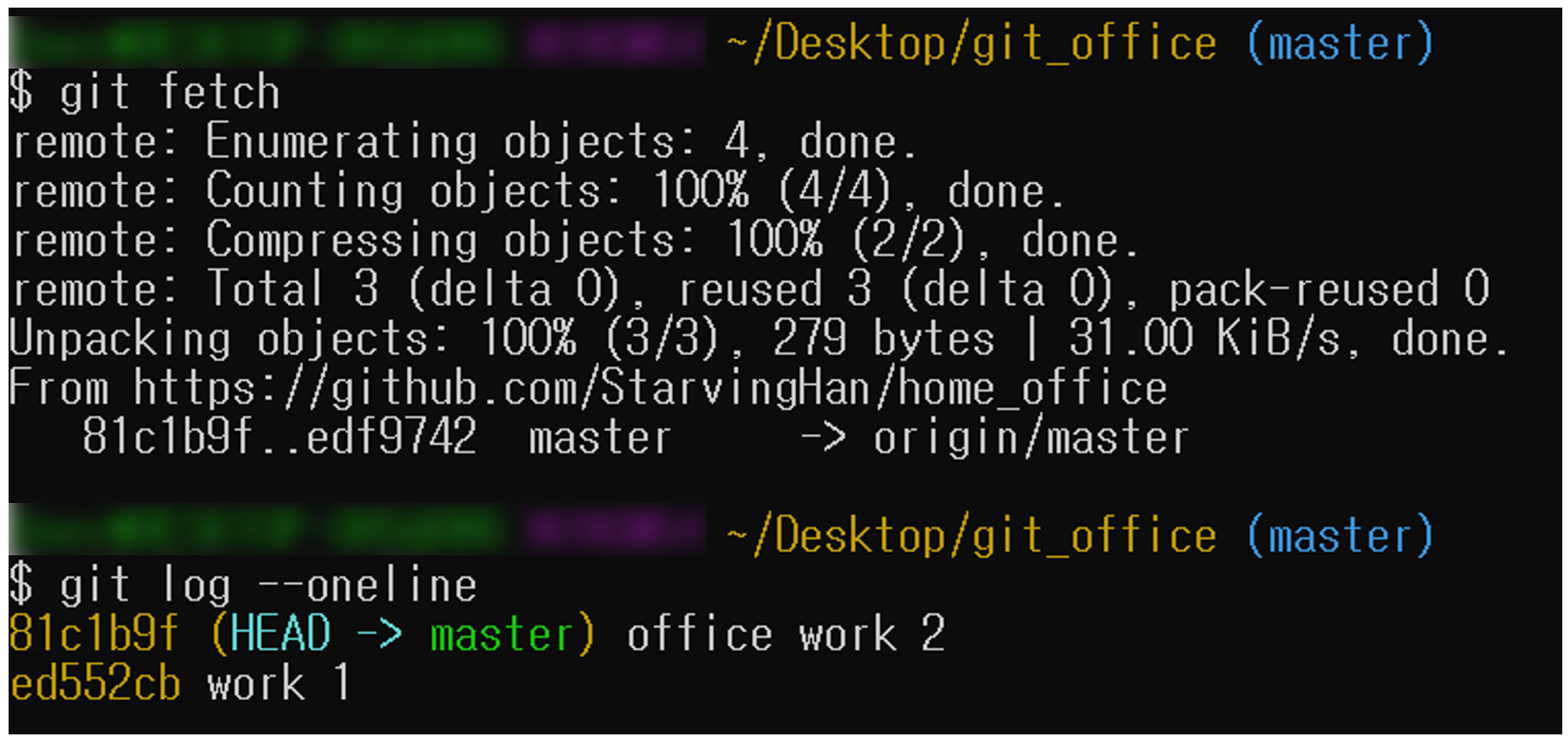 git_office 디렉토리에서는 원격저장소의 최신정보를 받지 못했기 때문에 아직 office work 2 커밋에 있는 것을 볼 수 있습니다.