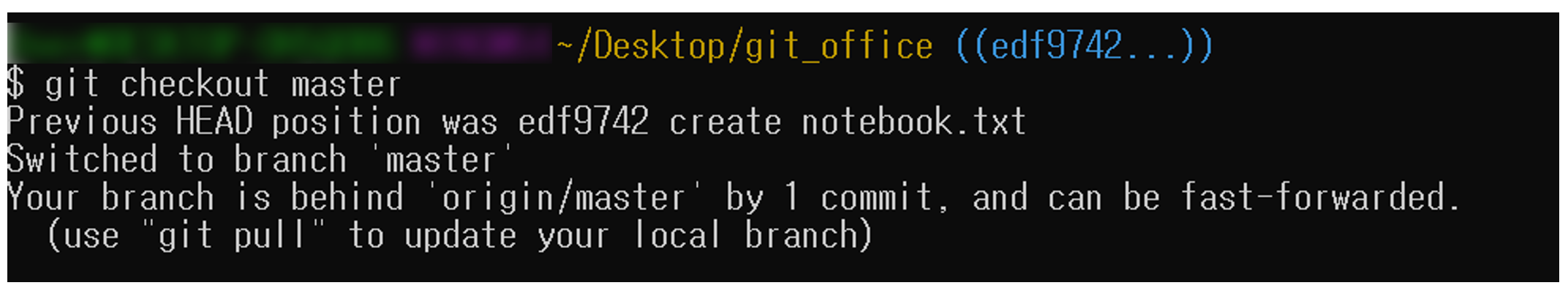 git checkout master 명령어를 입력하여 master 브랜치로 돌아가서 git fetch의 정보와 병합합니다.