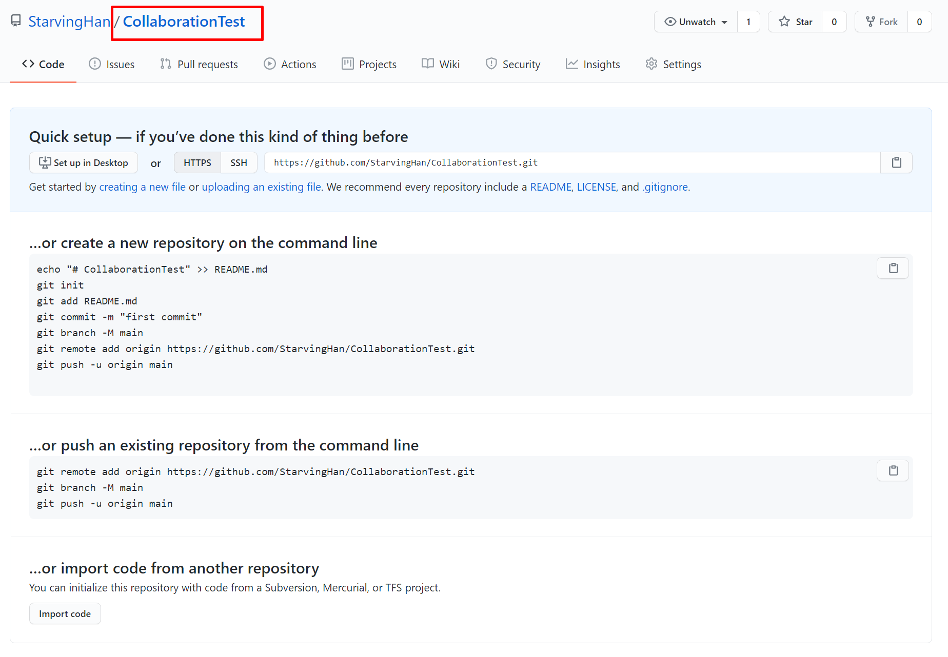 저는 github 홈페이지에서 CollaborationTest라는 원격저장소를 만들었습니다.