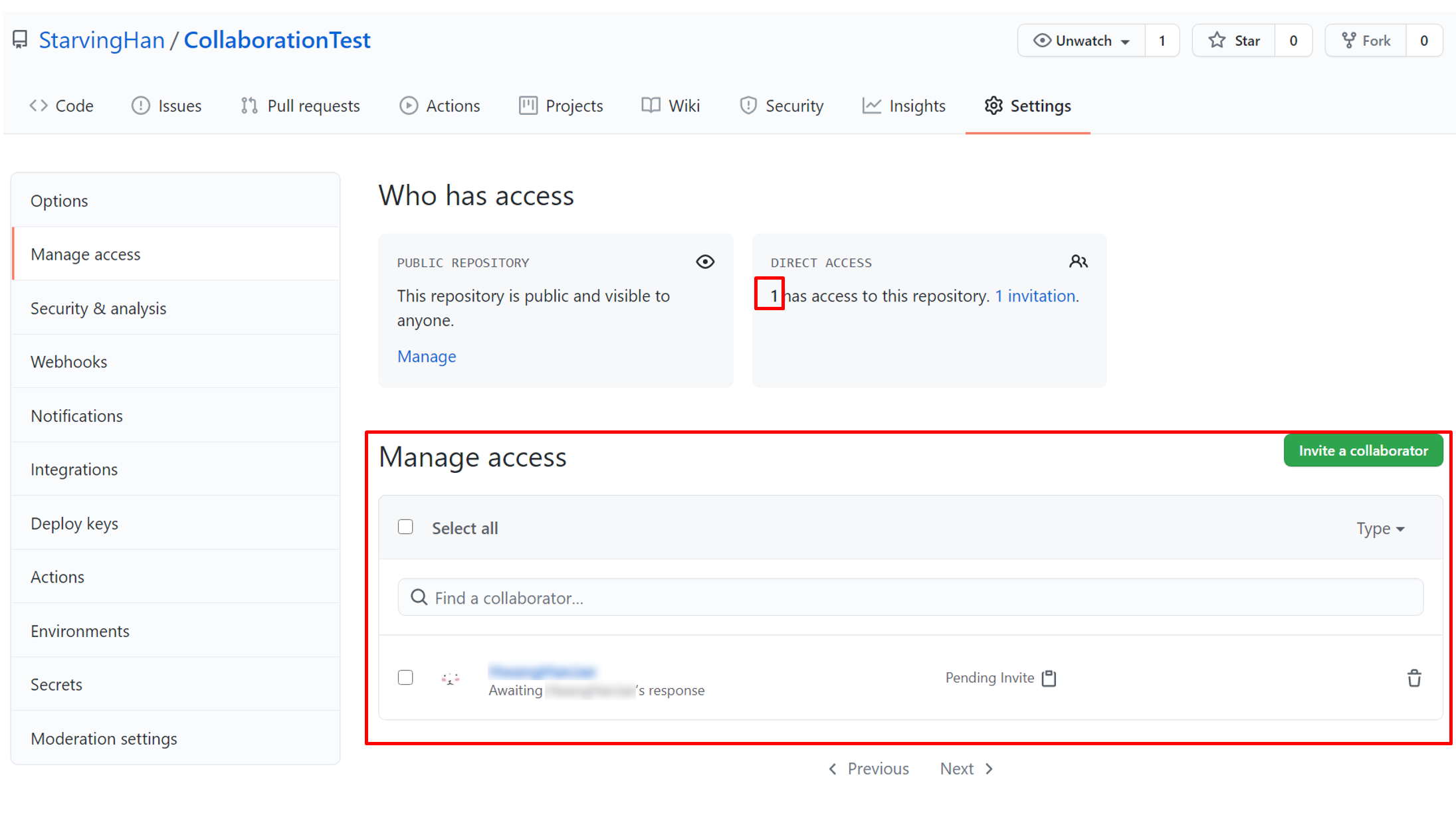 공동 원격 저장소의 주인의 계정에서 확인해보면 아래의 Awaiting 계정 's response 의 부분이 Collaborator로 바뀐것을 볼 수 있습니다.
