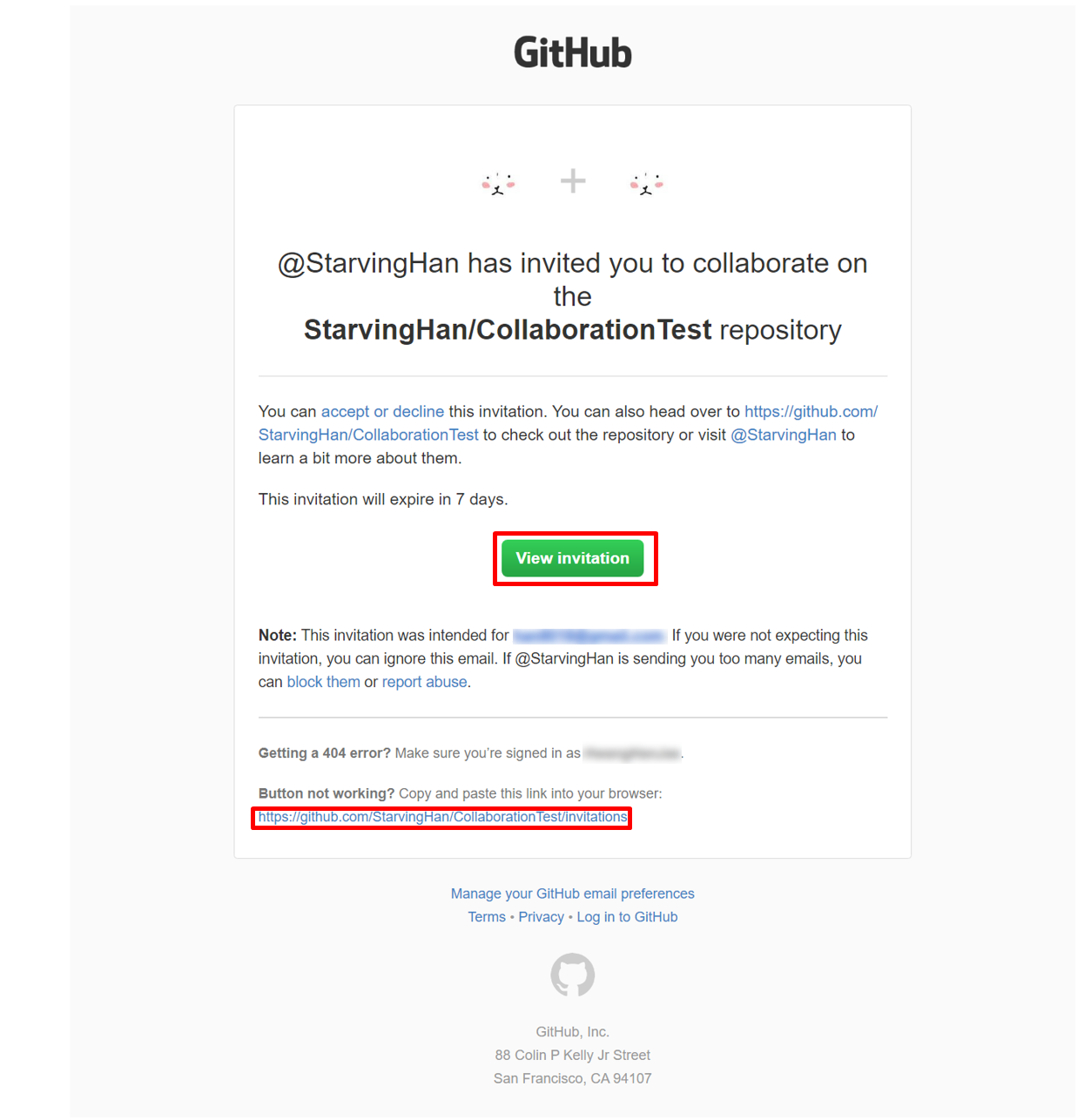 공동작업자의 메일로 가서 초대장의 View invitation버튼을 선택하거나, 사진에서 빨간 테두리로 표시해 놓은 초대 링크로 접속하시면 됩니다.